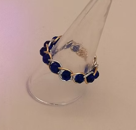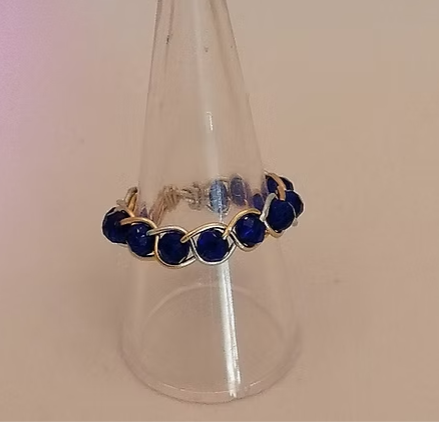 Fabriquée avec précision et soin, cette bague met en valeur un fil d’aluminium doré délicatement tressé. Ce matériau léger et résistant assure un confort optimal tout en garantissant une longue durée de vie à votre bijou. Les perles à facettes en verre de couleur bleue ajoutent une touche d’éclat et de fraîcheur, rehaussant le design global d’une manière captivante.