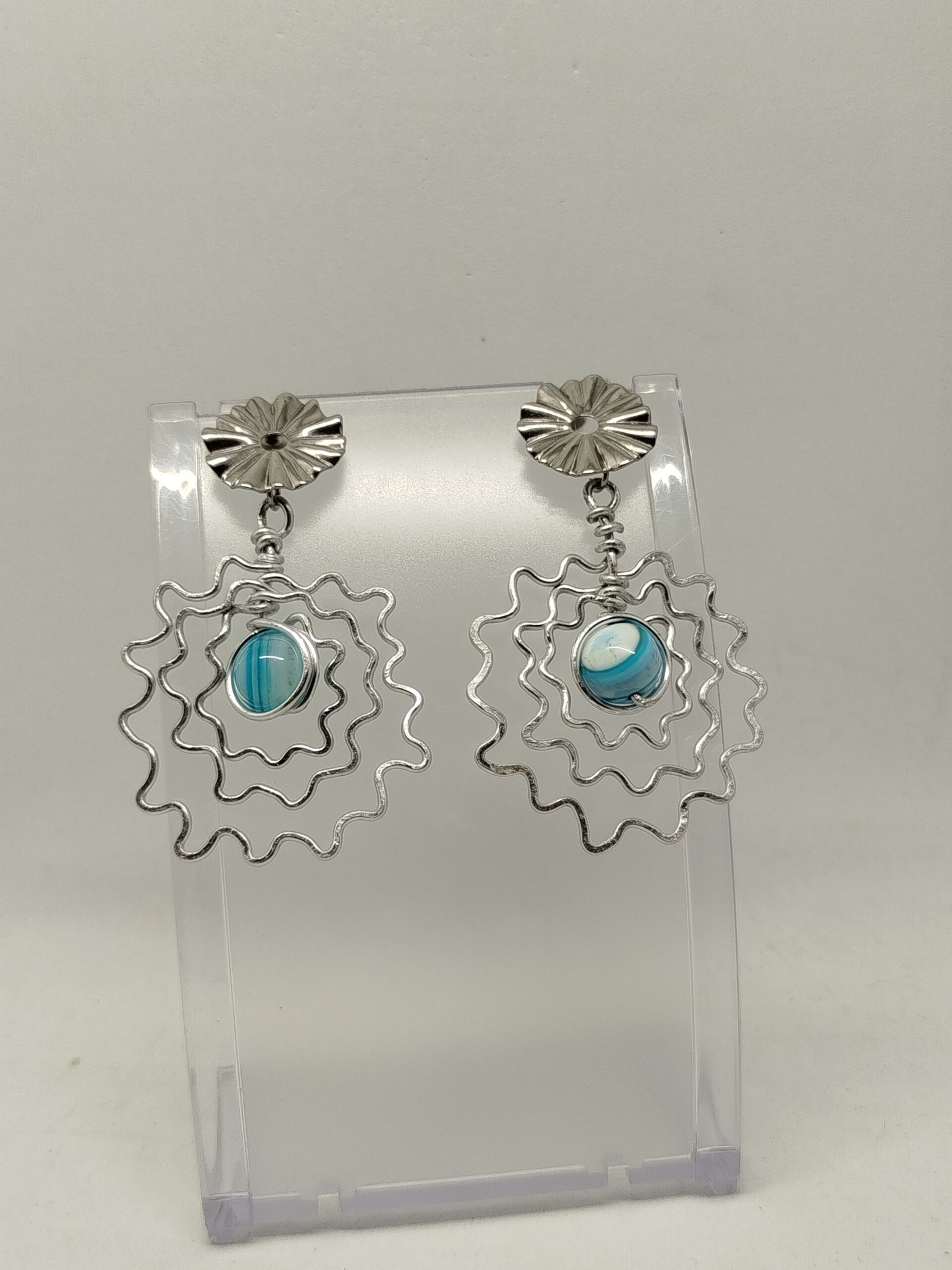 Ce bijou se distingue par son fil d’aluminium, à la fois léger et robuste, offrant une expérience de port agréable tout au long de la journée. La pierre agate rayée, minutieusement placée au centre, apporte une texture visuelle captivante et un charme naturel. Les clous d’oreilles en acier ne sont pas seulement solides mais hypoallergéniques, offrant ainsi une option idéale pour les peaux sensibles. Adaptées pour une utilisation quotidienne comme pour les occasions spéciales, ces boucles d’oreilles deviendront rapidement un indispensable de votre collection.