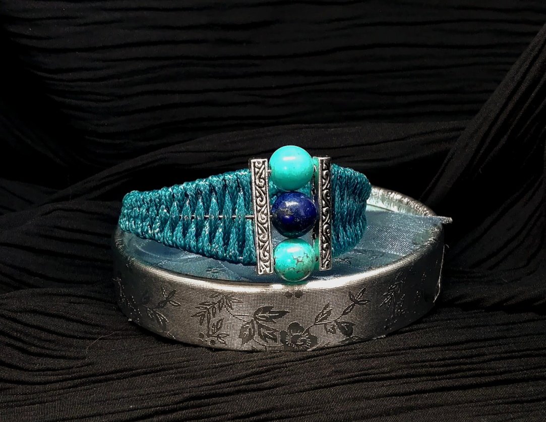 Ce bracelet se distingue par l’utilisation de pierres naturelles telles que le Lapis Lazuli et les Turquoises. Le bleu profond du Lapis Lazuli, associé aux nuances apaisantes des Turquoises, crée un équilibre parfait entre sophistication et style décontracté.