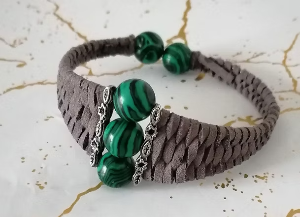 Bracelet Large En Suédine Grise et Pierres Malachites