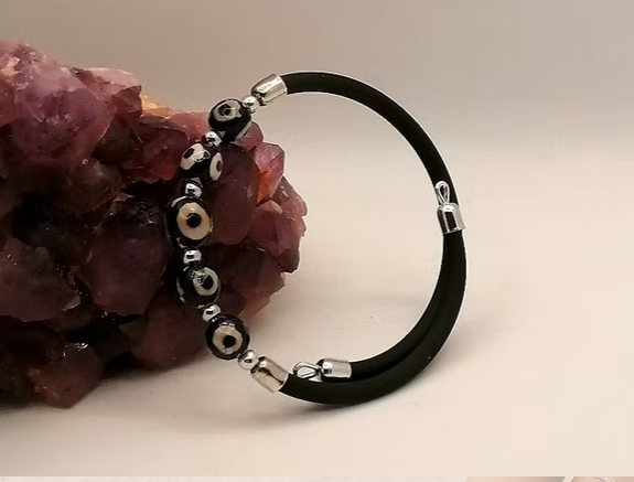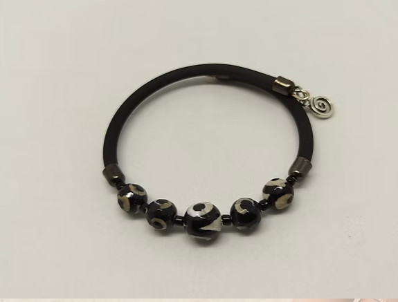 Ce bracelet est méticuleusement fabriqué avec des matériaux haut de gamme qui garantissent durabilité et confort. Les pierres Agate Tibétaine sont montées sur un cercle en acier à mémoire de forme, ce qui assure une tenue idéale et stable. Un revêtement en caoutchouc noir ajoute non seulement une touche moderne mais également un confort accru—ceci est particulièrement pratique pour un usage quotidien. Admirez le soin apporté à chaque détail, car ce bijou est conçu pour répondre aux attentes des plus exigeants.