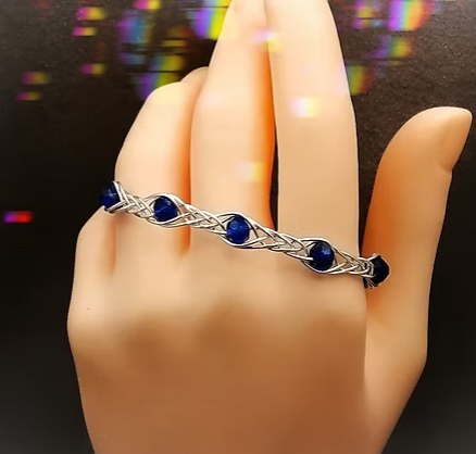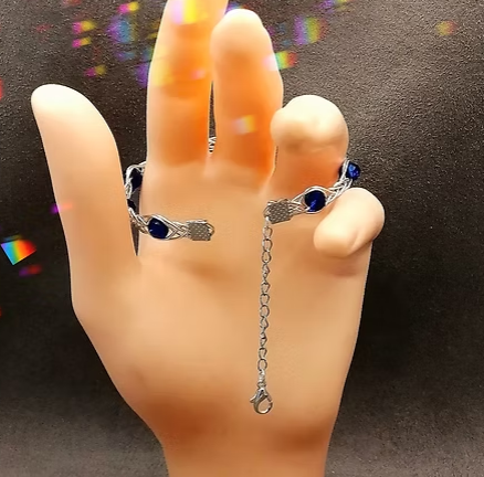Ce bracelet a été soigneusement réalisé en fil aluminium argenté, offrant un équilibre parfait entre légèreté et durabilité. Les perles en verre bleues ajoutent une touche de couleur subtile et brillante, tandis que l’ensemble reste confortable à porter grâce à sa finition impeccable. Avec sa longueur standard de 17 cm, ajustable grâce à une chaîne d’extension, il s’adapte parfaitement à tous les poignets.