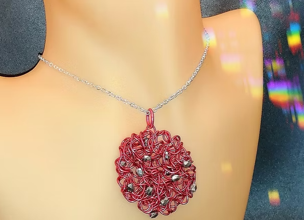 Le pendentif de 5 cm de diamètre est confectionné avec du fil d’aluminium, sélectionné pour son allure moderne et légère. Ce matériau robuste garantit durabilité tout en offrant une esthétique unique. Les petites perles intégrées au design ajoutent une touche délicate et féminine, faisant de ce collier un incontournable de votre collection d’accessoires.