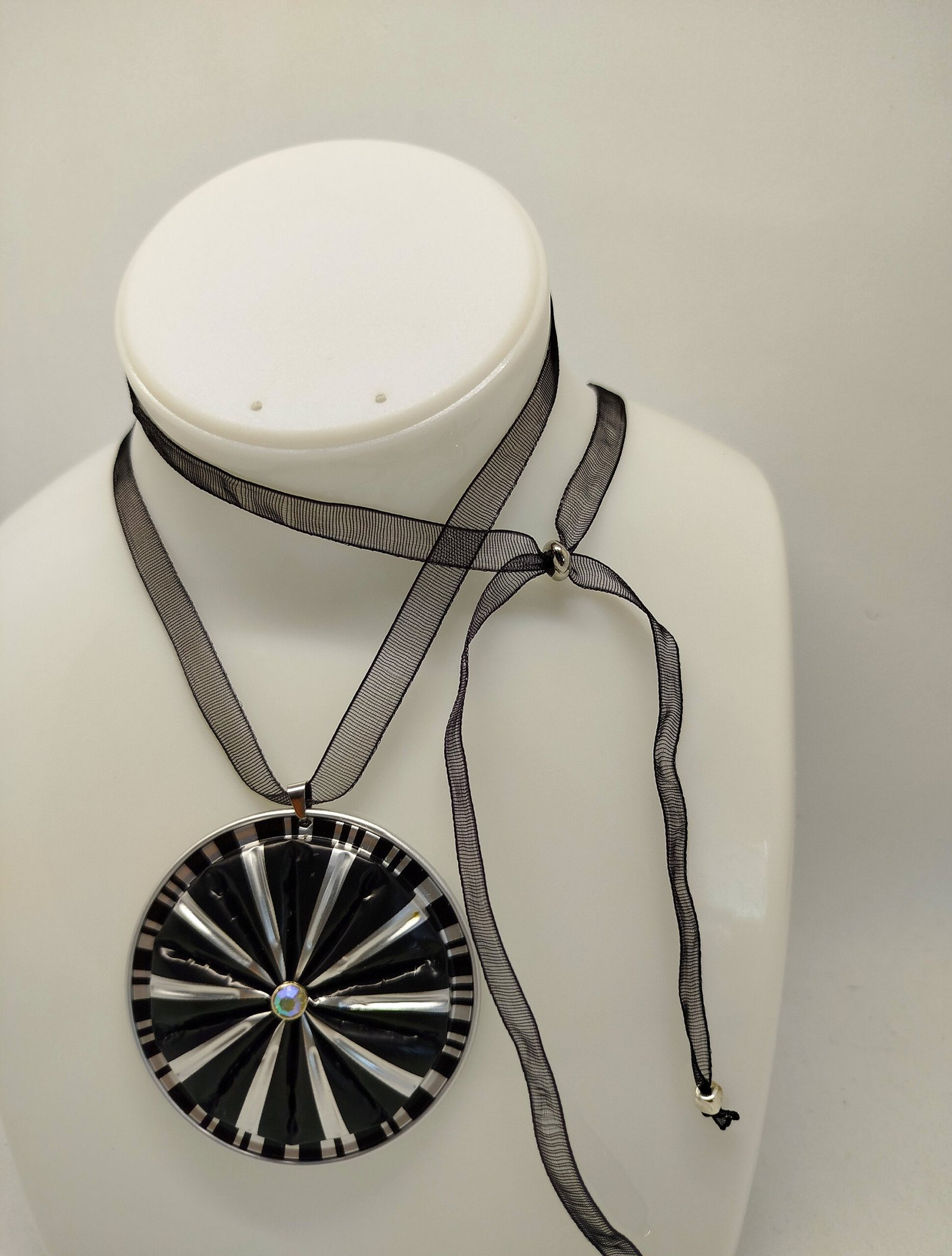 Ce collier n’est pas seulement un accessoire, mais une véritable œuvre d’art. Les capsules de café recyclées ajoutent une touche écologique et innovante. Leur finition artisanale sublime votre look tout en favorisant une consommation plus responsable. Les petites perles et strass fixées sur le pendentif complètent l’ensemble pour un charme irrésistible. De plus la bande d’organza constitue le collier, se distingue par sa légèreté et son élégance, tout en étant parfaitement ajustable grâce à sa perle de positionnement réglable.