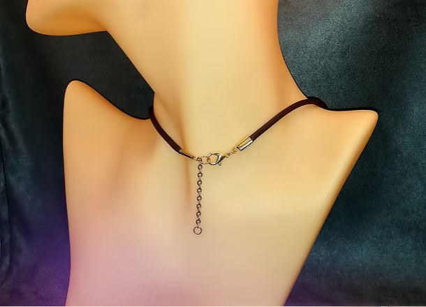 La chaîne en caoutchouc marron, robuste et élégante, suspend le collier et s’adapte parfaitement à votre cou. Son fermoir mousqueton doré assure une fermeture sécurisée et pratique. Avec ses 42 cm et son extension de 4 cm, le collier se porte ras du cou pour un style chic ou légèrement plus long pour un look détendu et moderne