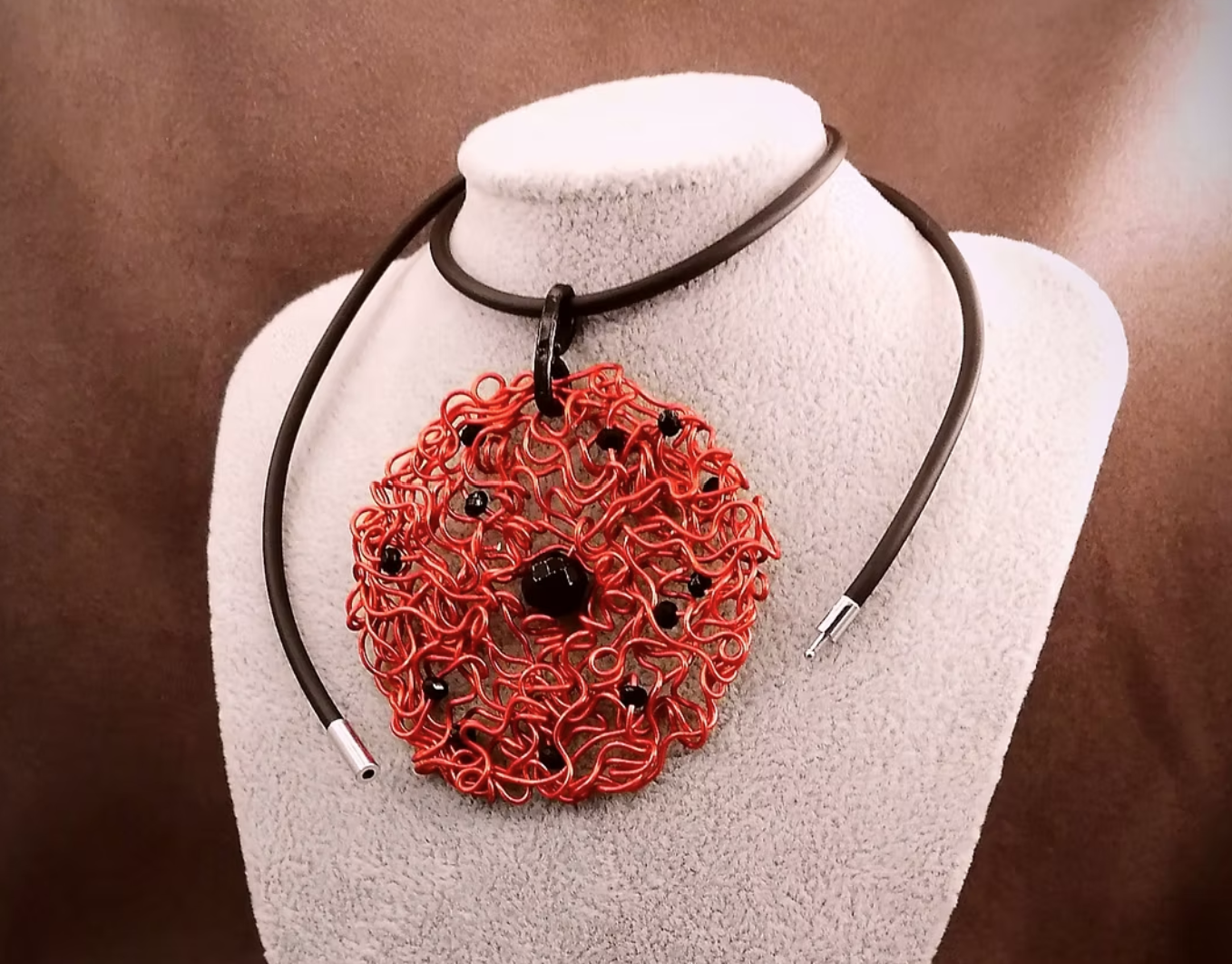Le pendentif de 6,5 cm, minutieusement façonné à la main en fil d’aluminium rouge, offre un aspect vibrant et unique. Des perles à facettes noires ajoutent un subtil contraste, tandis qu’une pierre naturelle Onyx au centre apporte profondeur et raffinement.