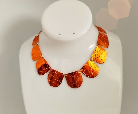 Laissez-vous séduire par ce collier soigneusement composé de plusieurs morceaux de fil aluminium plat couleur safran, ornés d’un motif crocodile. Ces éléments sont créés à la main, mettant en valeur le savoir-faire artisanal dans chaque détail. Ce bijou, à la fois sophistiqué et audacieux, est conçu pour ajouter une touche de caractère et de raffinement à votre tenue.