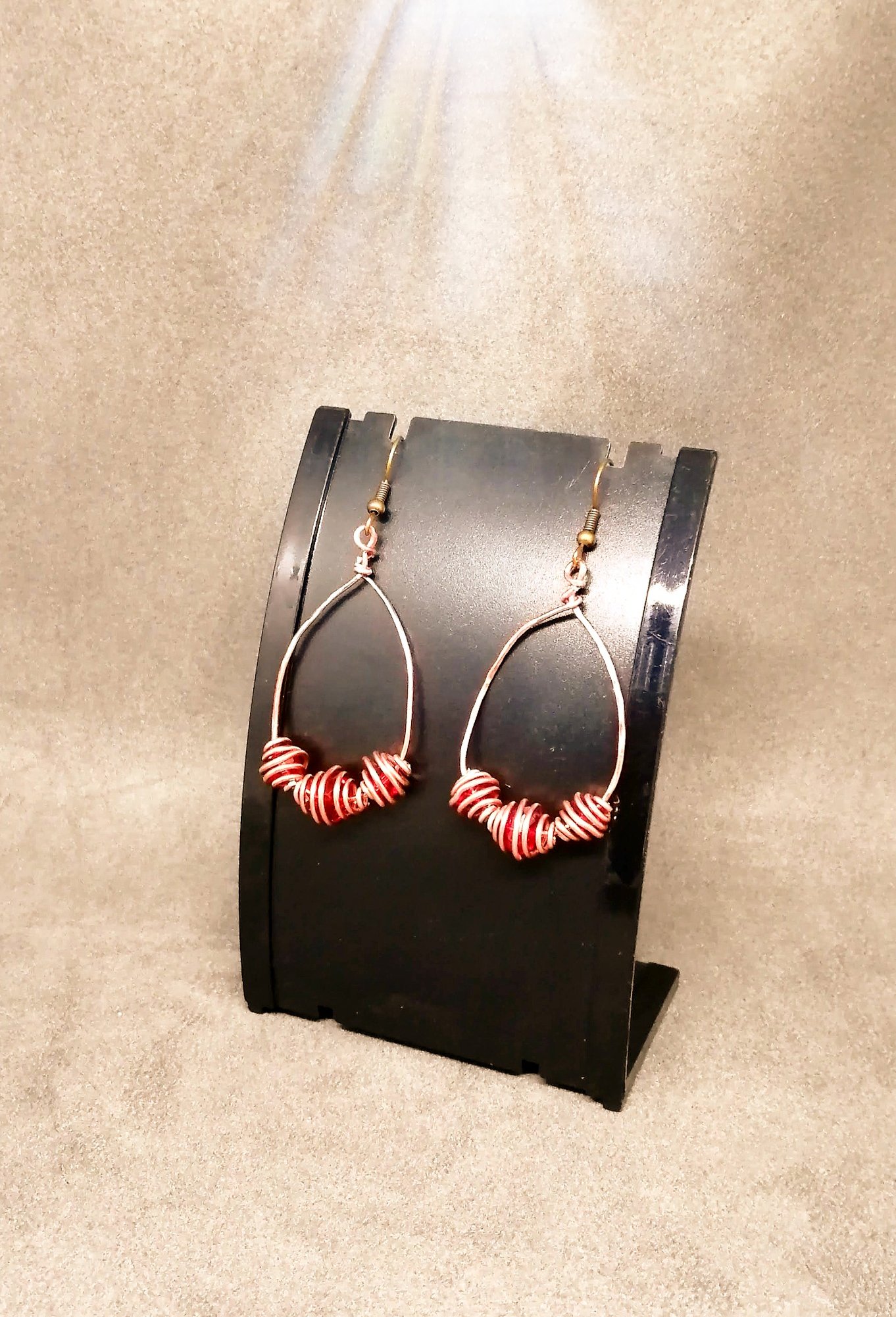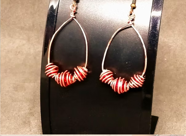 Chaque créole est ornée de 3 petites cages à perles, un détail remarquablement original qui ajoute profondeur et élégance. Une perle à facettes rouge au centre illumine la pièce, offrant une subtile touche de couleur et de dynamisme. Fabriquées en fil d’aluminium cuivré légèrement martelé, ces boucles d’oreilles offrent une finition brillante tout en garantissant une excellente durabilité et stabilité. Le choix du métal accentue leur aspect artisanal et donne à leur texture une apparence moderne et intemporelle.