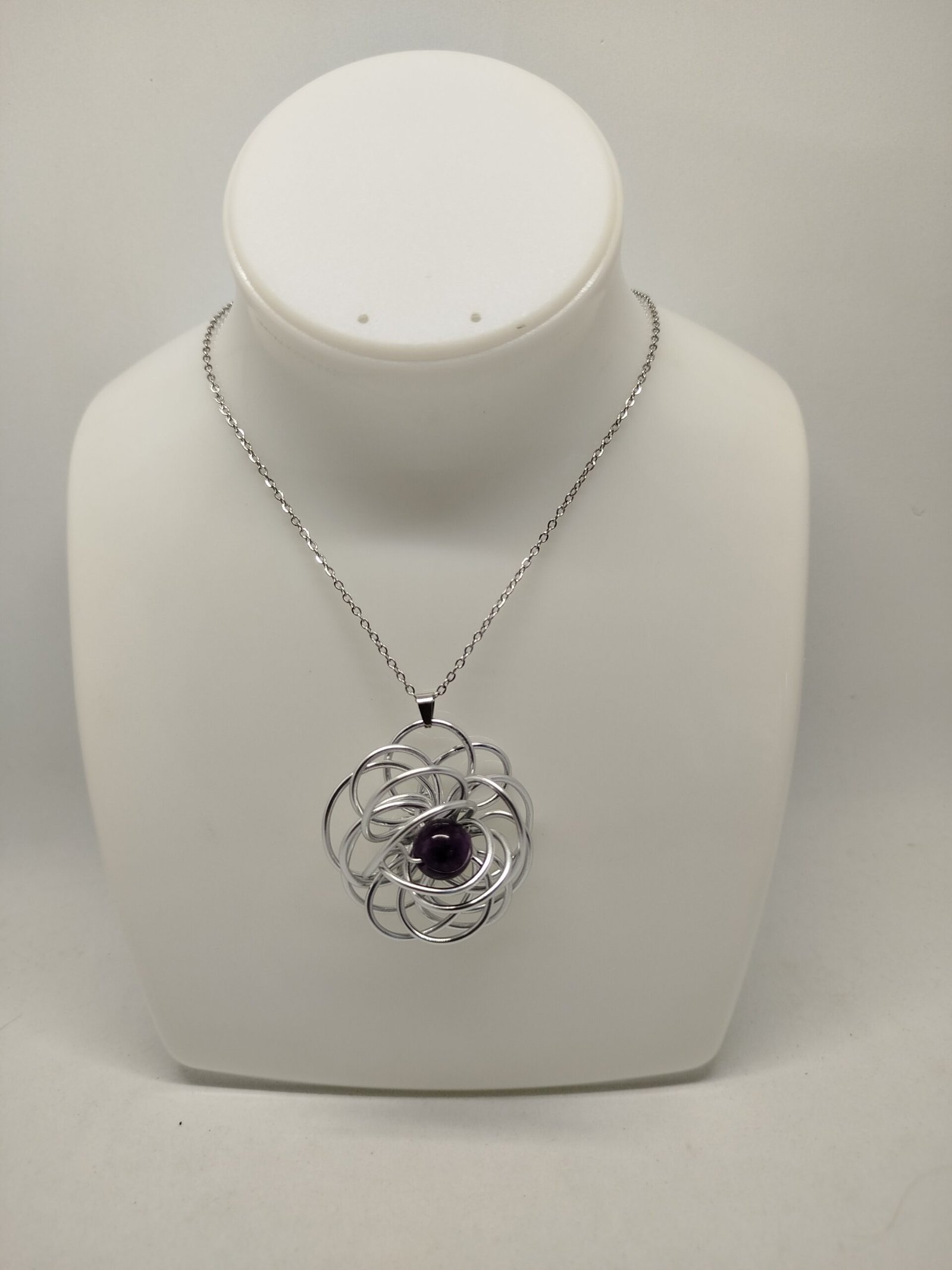 Ce pendentif est monté sur un collier en acier inoxydable durable, résistant à la corrosion. Son fermoir mousqueton solide et pratique assure confort et sécurité. Le fil d’aluminium argenté apporte une touche moderne qui met en valeur l’éclat violet de l’améthyste.