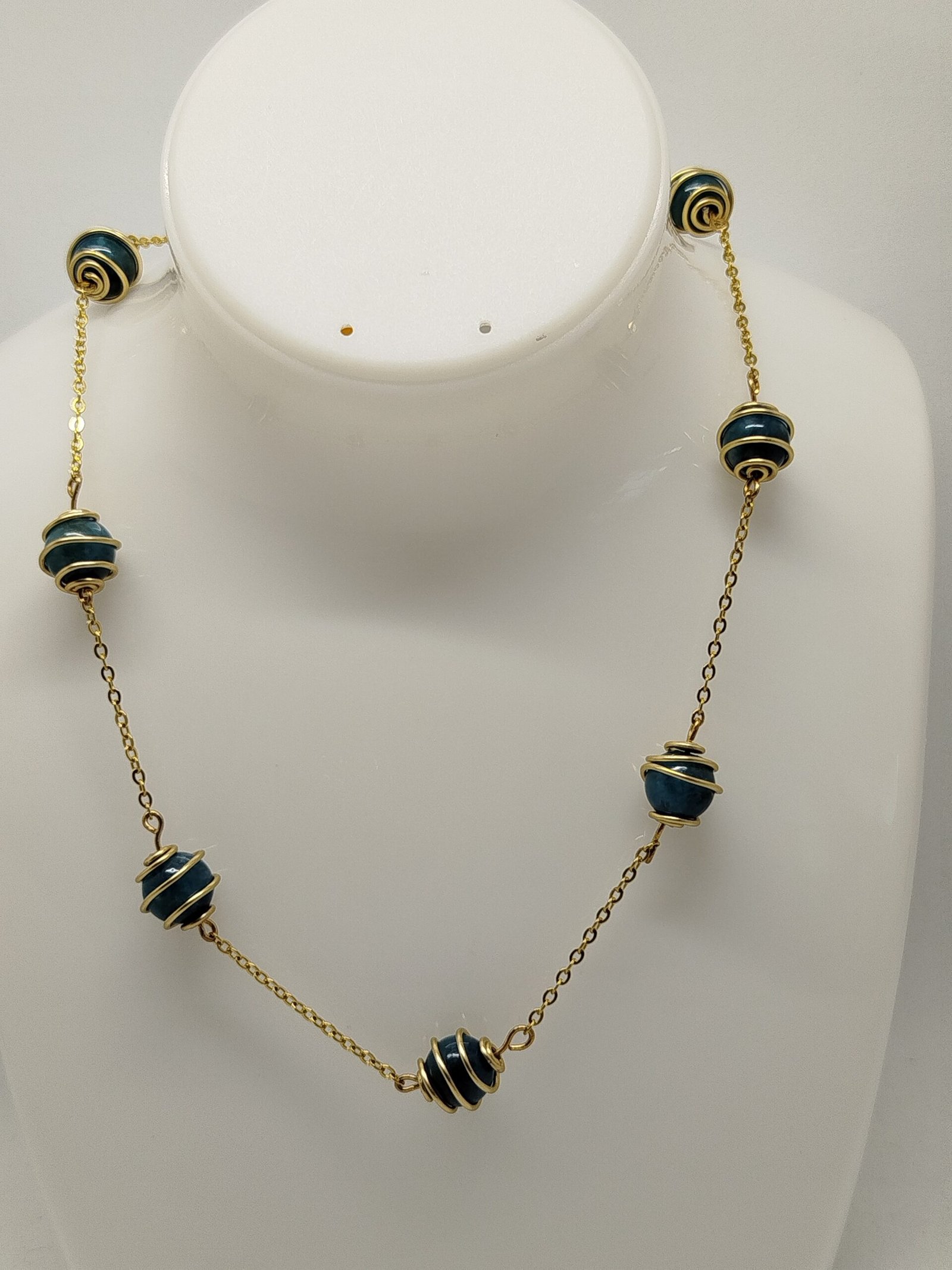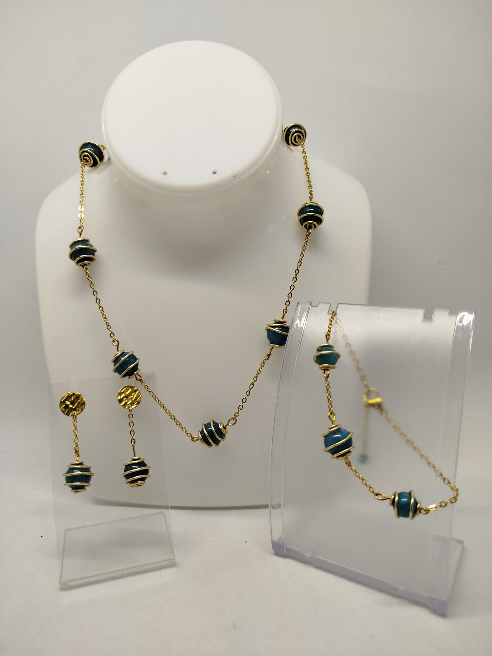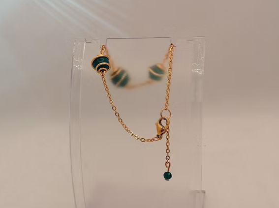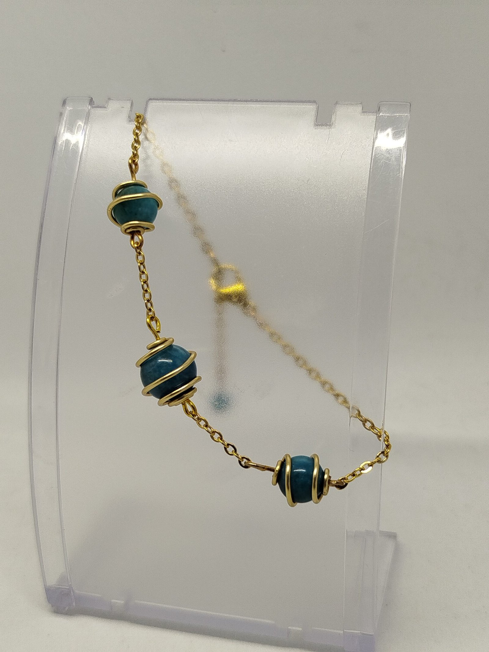 Peaufinez votre tenue grâce à cet ensemble de bijoux qui allie style et artisanat. Chaque pièce est méticuleusement crée à la main avec des pierres naturelles d’Apatite, réputées pour leur teinte raffinée. Chaque pierre est enveloppée dans de délicates cages en spirales, confectionnées à partir de fils aluminium couleur doré, offrant un mariage parfait entre la modernité et la sophistication naturelle.