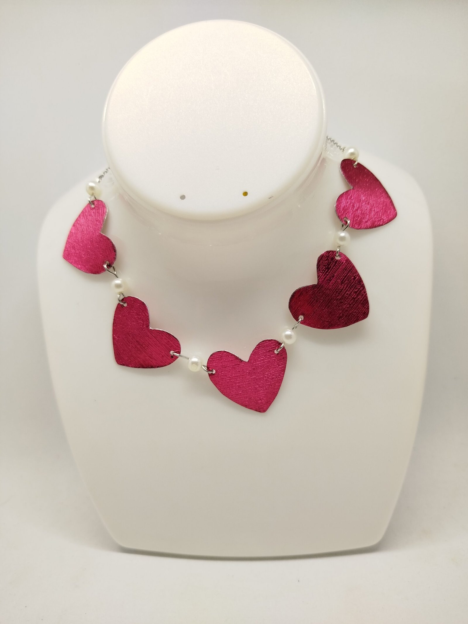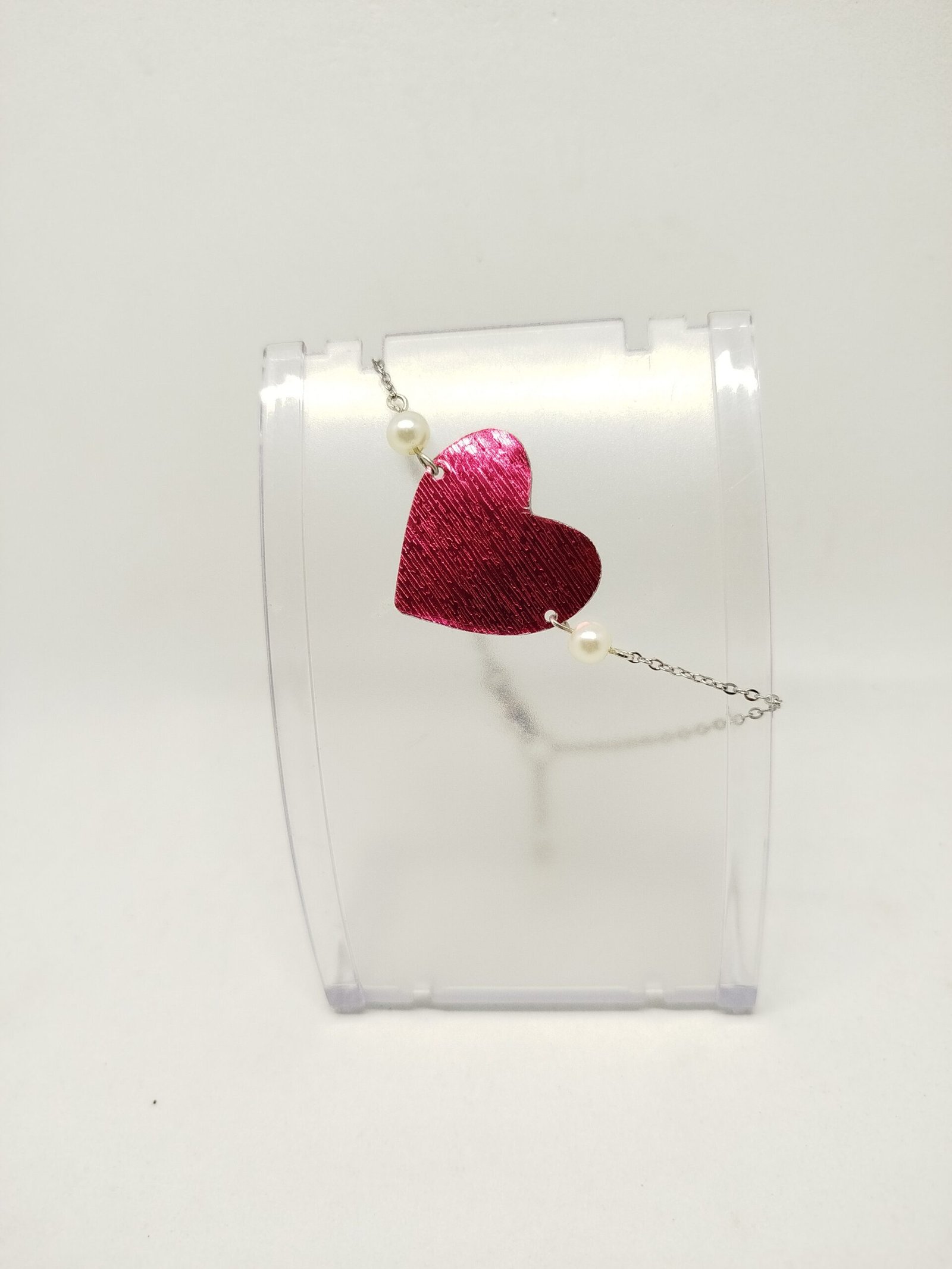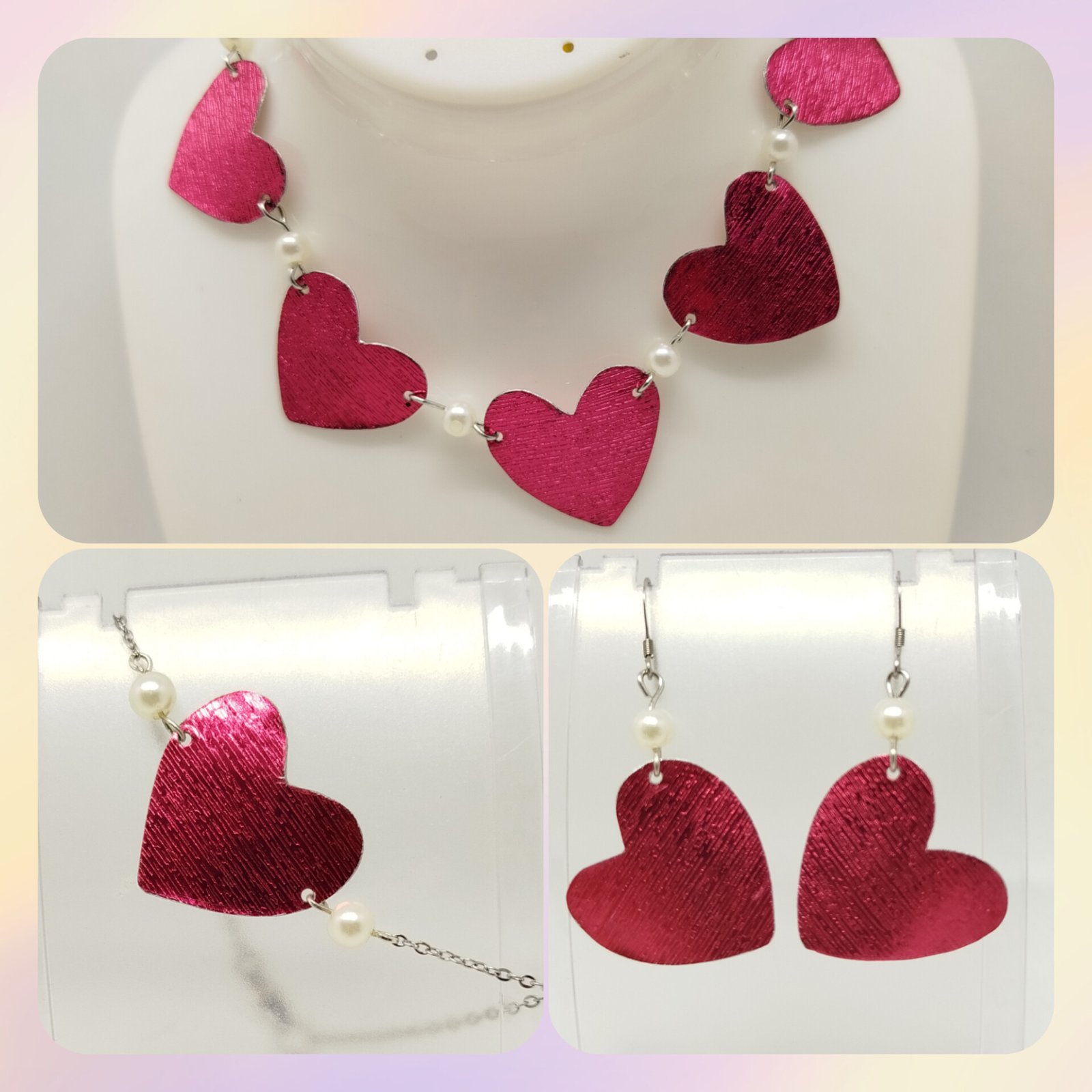 Chaque pièce de l’ensemble — collier, bracelet et boucles d’oreilles — est reliée par de délicates perles blanches. Elles apportent douceur et élégance à la structure métallique rouge. Le contraste entre l’intensité du rouge et la pureté des perles crée un bijou féminin, moderne et original.
