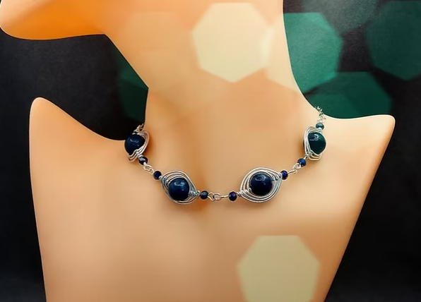 Pour compléter votre look, ce set inclut un bracelet assorti. Il est composé de trois belles pierres Lapis Lazuli entourées de fil aluminium. Ce bracelet s’harmonise parfaitement avec le collier et constitue une extension naturelle de l’élégance qu’il incarne. Les boucles assorties viennent parfaire cet ensemble, apportant une finition délicate et un style coordonné sur mesure. Que ce soit pour un événement spécial ou pour ajouter une touche sophistiquée à votre quotidien, cet ensemble est conçu pour impressionner et mettre en valeur votre style unique.