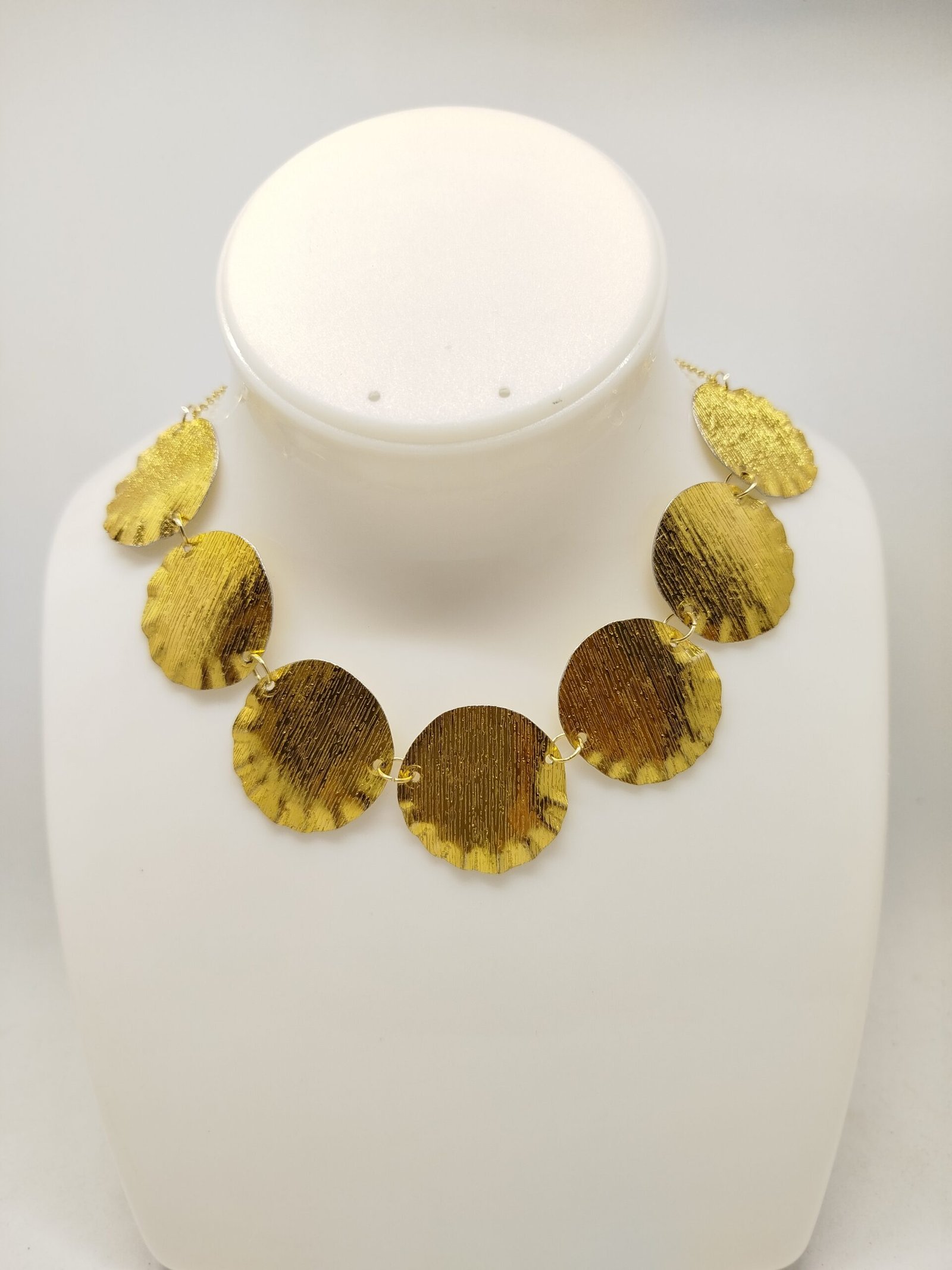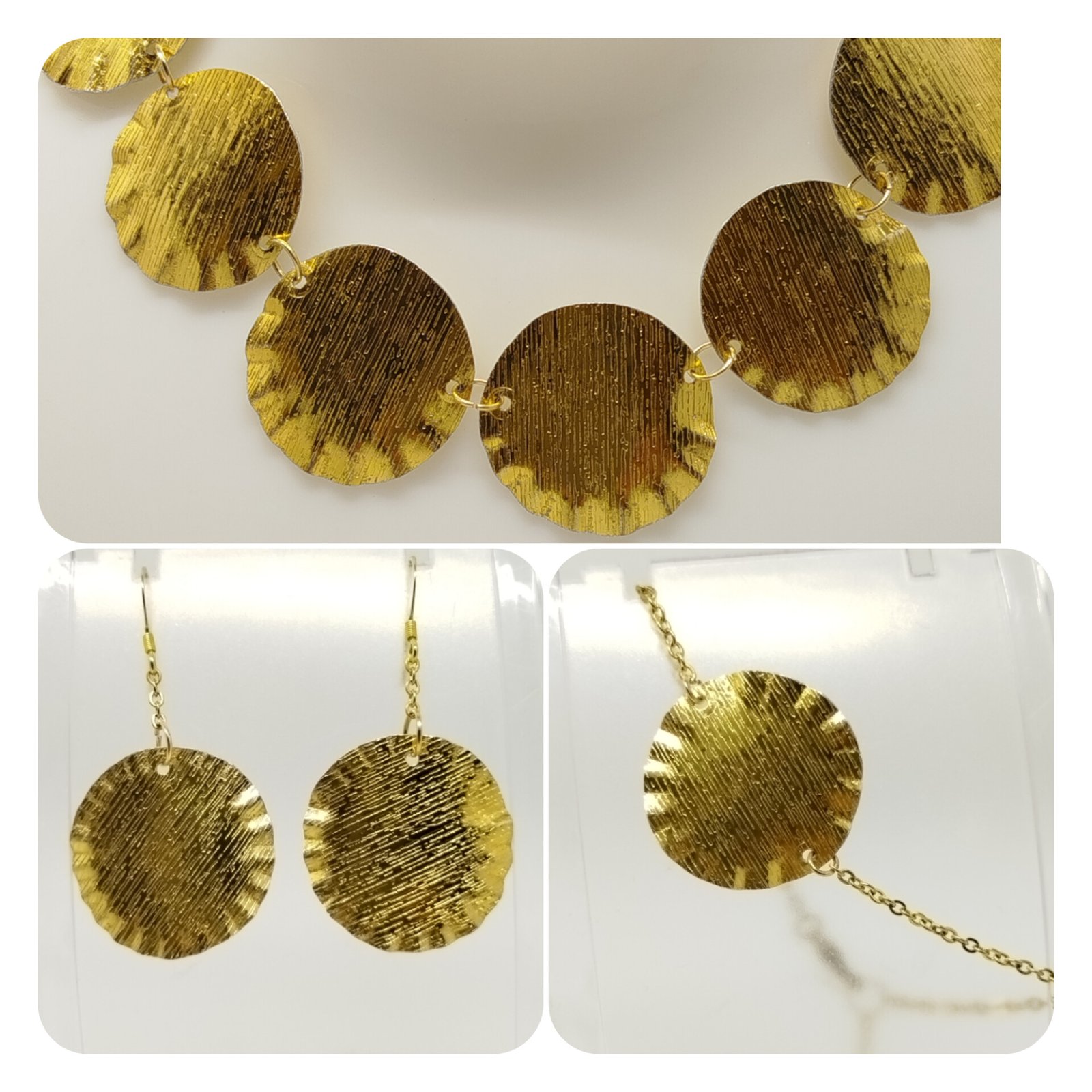 Ce somptueux ensemble est réalisé à partir de fil d’aluminium plat de couleur dorée, apportant une touche chaleureuse et luxueuse. Le design fait à la main garantit une esthétique unique, tout en préservant la qualité et la durabilité de chaque pièce.</strong> Le collier chaîne, mesurant 40 cm et fabriqué en acier inoxydable doré, ajoute un éclat subtil et résistant à l’usure quotidienne. Les boucles d’oreilles et le bracelet assortis complètent parfaitement l’ensemble, créant une composition harmonieuse qui convient à toutes les occasions.