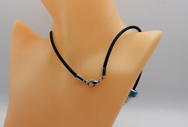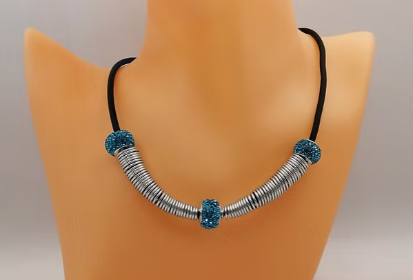 Ce magnifique collier se distingue par ses 3 perles strass bleu, disposées avec goût pour refléter la lumière et attirer subtilement de nombreux regards. Des tubes en fil d’aluminium argenté complètent parfaitement les perles. On fixe ce design moderne et raffiné sur un collier en caoutchouc noir de 45 cm, doté d’un fermoir mousqueton robuste pour un port sûr et pratique.