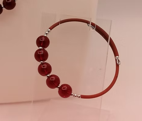 Le bracelet inclus dans cet ensemble est réalisé dans un design ingénieux et adaptable. Il est monté sur un cercle en acier à mémoire de forme, habillé de caoutchouc marron, mettant en valeur cinq superbes pierres grenat. Sa conception flexible lui permet de s’adapter à la majorité des tailles de poignets, variant entre 17 et 21 cm. Cela garantit que ce bijou allie esthétique et confort pour s’ajuster parfaitement à votre style et à votre morphologie.
