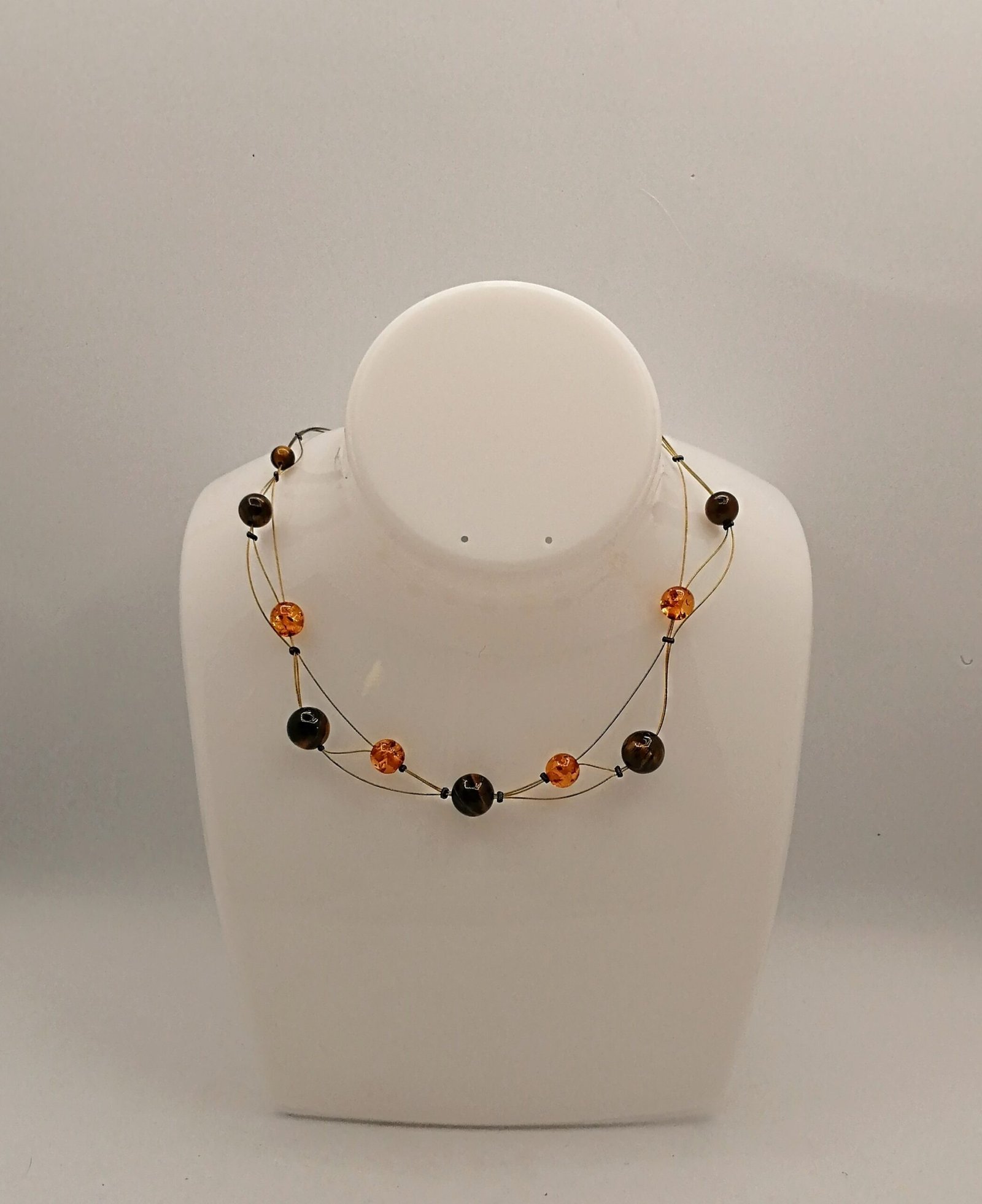 Ajoutez une touche de sophistication à votre tenue avec ce magnifique collier composé de 7 sublimes pierres Œil de Tigre et 4 éclatantes perles d’Ambre. Conçu avec soin, chaque élément est fixé sur des câbles à bijoux de couleur dorée, offrant une allure à la fois moderne et élégante. Avec une longueur de 43 cm, ce collier repose parfaitement autour du cou et se ferme facilement grâce à son fermoir mousqueton pratique. Il est idéal pour les occasions spéciales ou pour rehausser votre tenue quotidienne.
