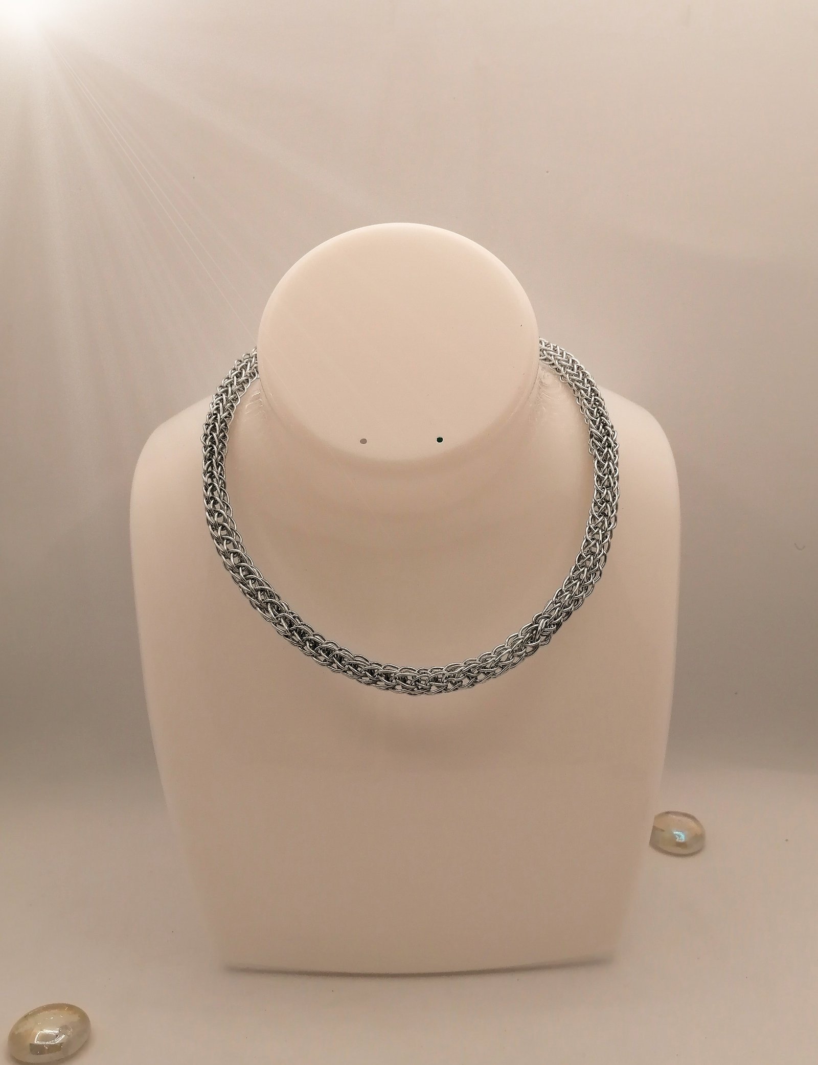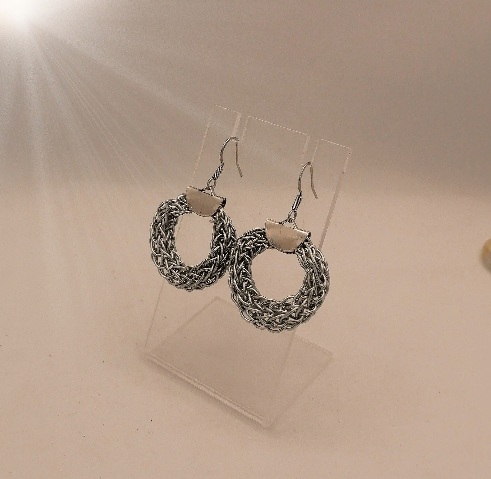 Cet ensemble unique et soigneusement réalisé à la main incarne le mariage entre tradition et modernité. Confectionné à partir de fils d’aluminium argenté, il utilise la technique captivante du tricotage viking, mêlant habillement nœuds et tissages délicats. Que vous souhaitiez compléter votre tenue de soirée ou apporter une touche de sophistication à vos tenues quotidiennes, ce collier et ces créoles s’imposent comme des éléments indispensables de votre collection de bijoux.