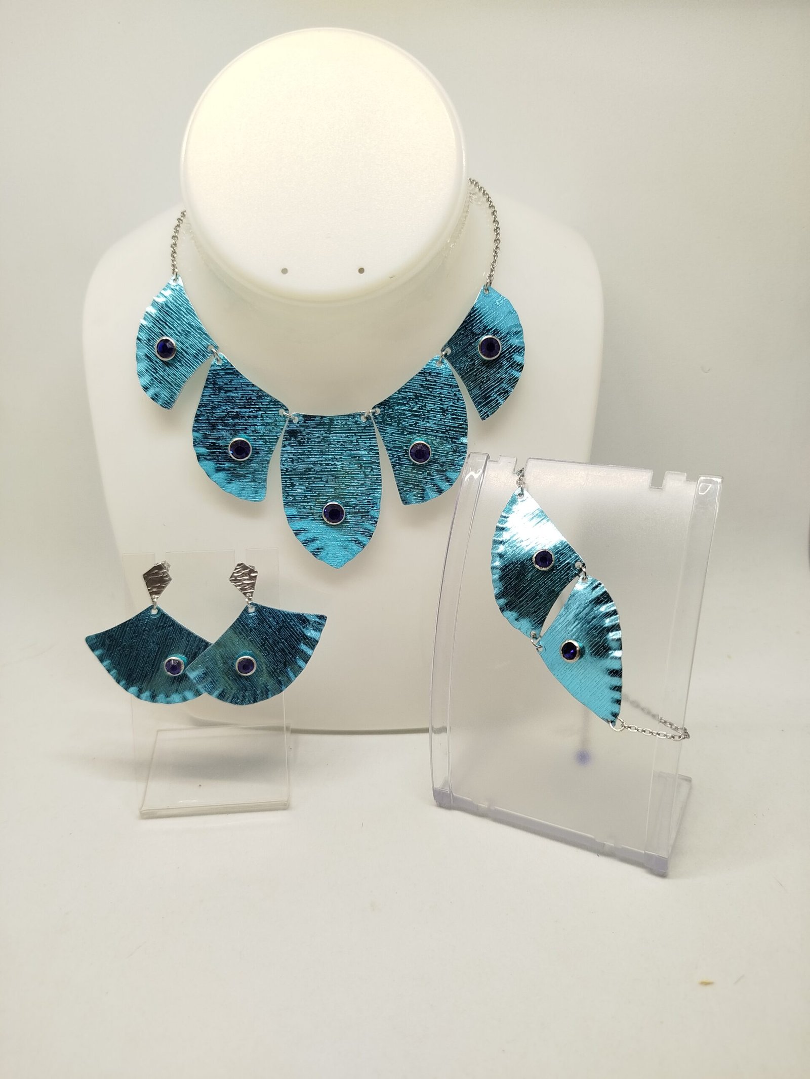 Sublimez votre style avec cet ensemble en fil aluminium bleu clair, soigneusement conçu pour être un incontournable dans votre collection de bijoux. Chaque pièce de cet ensemble — un collier, des boucles d’oreilles et un bracelet assortis — reflète une fusion parfaite d’élégance et d’originalité. Avec ses tons délicats et sa conception artisanale, vous serez sûr(e) d’attirer l’attention partout où vous irez.
